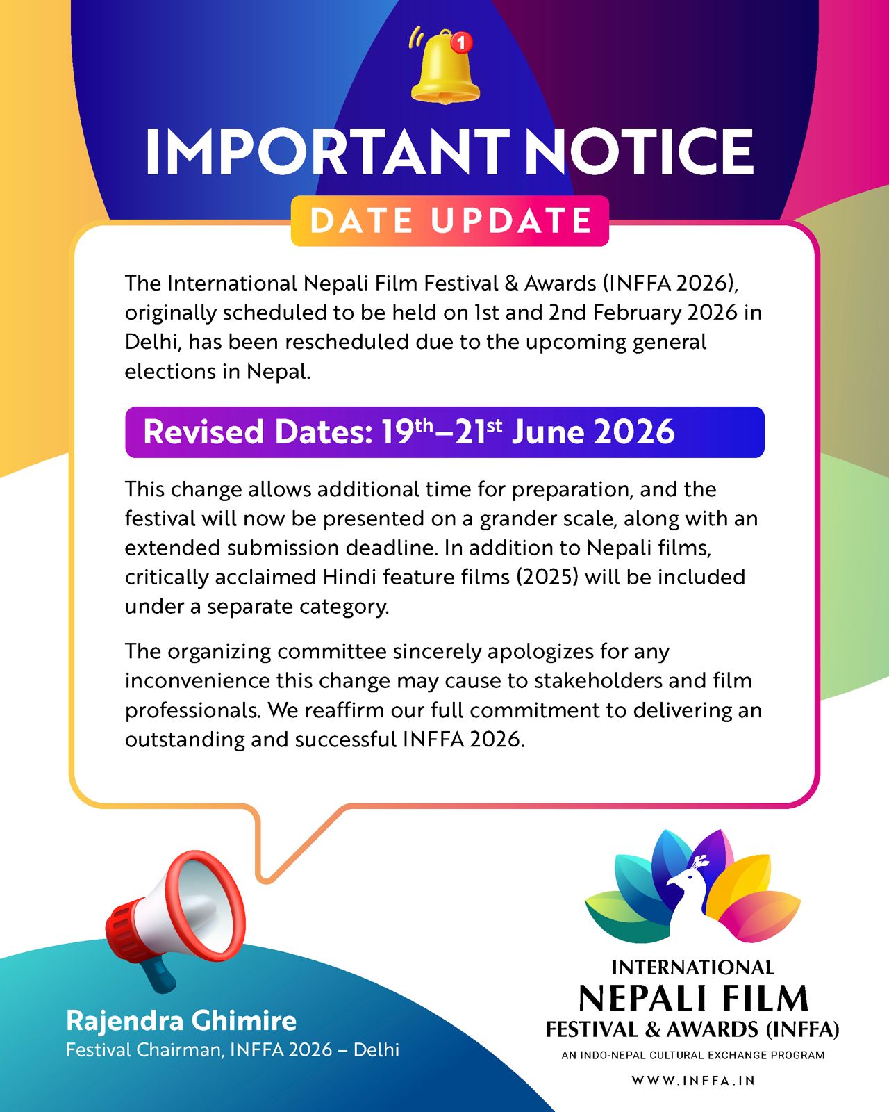 The International Nepali Film Festival & Awards (INFFA) is envisioned as a flagship cultural Initiative that goes beyond celebration to a strategic single platform designed to strengthen bilateral relations, foster collaboration, and create lasting impact, thus helping open new market for Nepali movies in India, promote Nepal as a shooting destination for Indian Movie industry and foster joint collaborations, talent exchange, and economic opportunity.